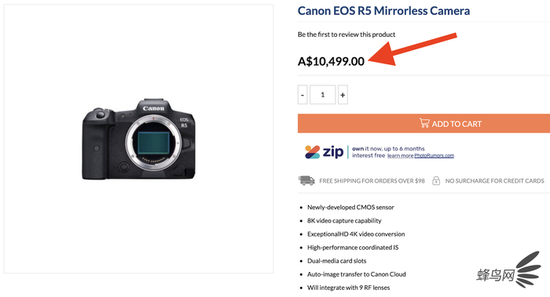 佳能EOS R5全画幅无反相机的标价达到了10499澳元,约合人民币47900元
