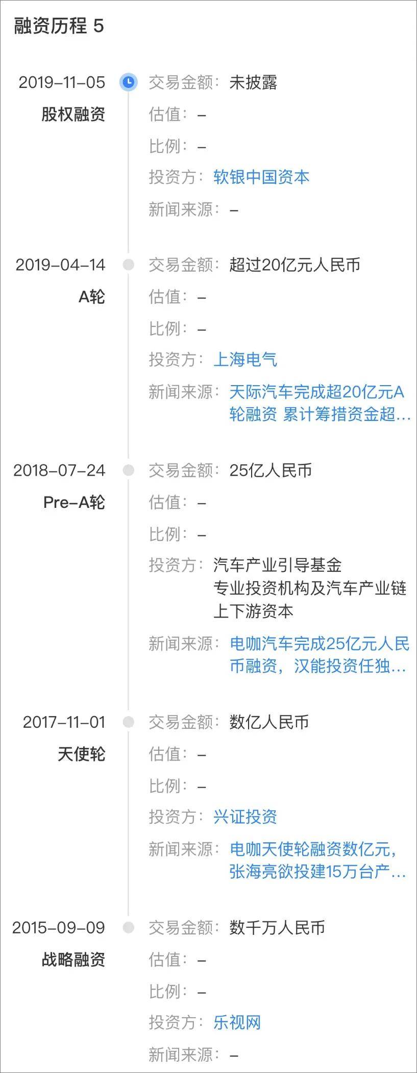 通过天眼查的数据,可以看到天际汽车目前一共进行了五轮融资,最近一轮发生在去年11月5日,投资方为软银中国资本;五轮融资的累计总额约在65亿元。