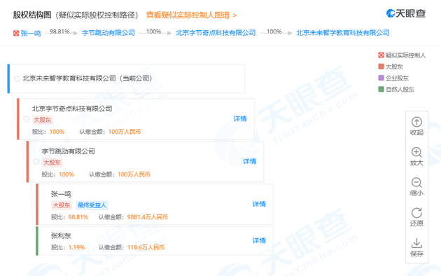 北京未来智学教育科技有限公司成立于2019年12月,注册资本100万人民币,公司经营范围包括互联网信息服务、广播电视节目制作、从事互联网文化活动、零售出版物、公共关系服务等。而北京字节奇点科技有限公司由字节跳动有限公司全资持股,后者最大股东为张一鸣,持股比例98.81%。张一鸣亦为瓜瓜龙英语的最终受益人。