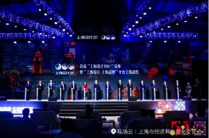 图:上海信息消费云峰汇开幕式现场,上海市政府秘书长陈靖,上海市政府副秘书长陈鸣波,上海市经济信息化工作党委书记陆晓春,上海市经济信息化委主任吴金城,携电商平台和设计企业代表,共同启动首届“上海设计100+”产品上线专区仪式。