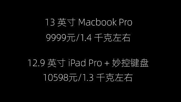 照这个思路想下去,下半年Office for iPad就会对于触控板和光标进行适配,加上需要精确点按的游戏也会加入适配的大军中,听着前景很美好,但是问题也随之而来:支持触控版的妙控键盘,起售价为2399元,和12.9英寸的iPad Pro组合后,重量与价格都直线上升,那么在这个前提下,为什么我不选择Macbook Pro呢?