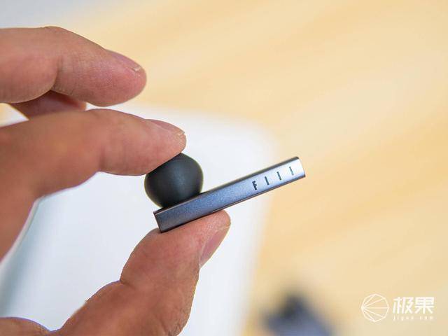 取出耳机之后,可以看到在它身上有着更多的细节。首先它的耳机和耳柄的部分采用分离式的设计,并用了材质和颜色上的区分。耳柄部分采用矩形柱的设计,在矩形柱边角的位置有一枚麦克风,它主要用来降噪处理。在它下方为触控区域,下半部分则分别有‘FIIL’的品牌漏出以及L、R标示。