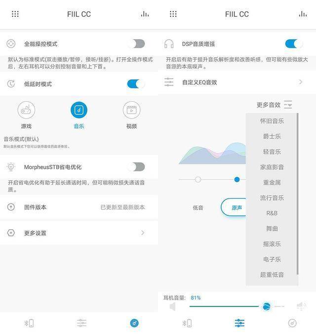给耳机适配APP,这几乎在无线耳机圈里是很少能见到的,FIIL CC可以通过专门针对FIIL耳机设计的APP“FIIL+”,来控制耳机。APP内置了十余种预设方案,实现DSP音质增强以及耳机音效的调节,除此之外还可以通过APP可查看剩余电量、固件升级等常规操作。APP界面设计简洁,该有的功能一个都不少。