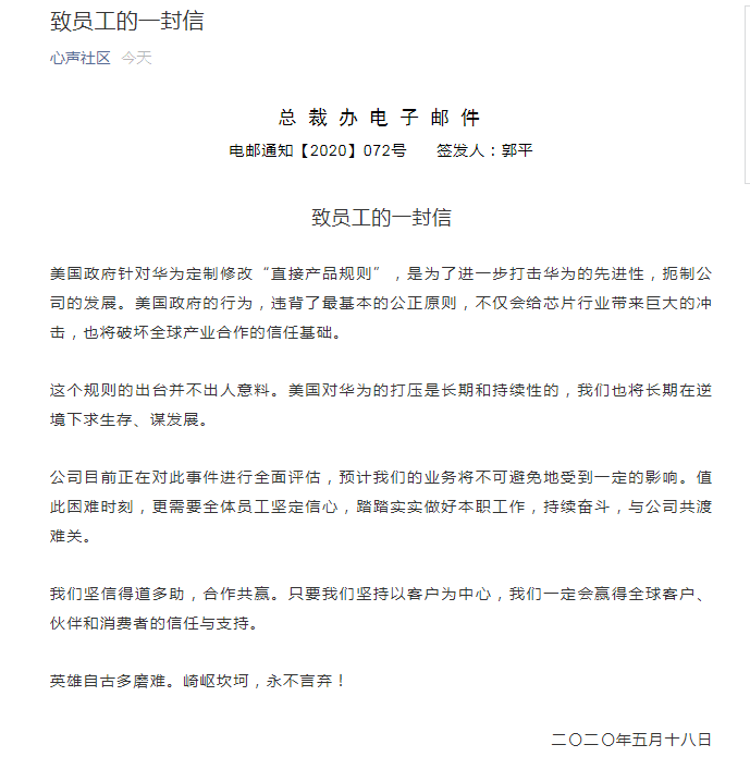 据华为心声社区官方微信5月18日消息,华为发布致员工的一封信,以下为公开信全文: