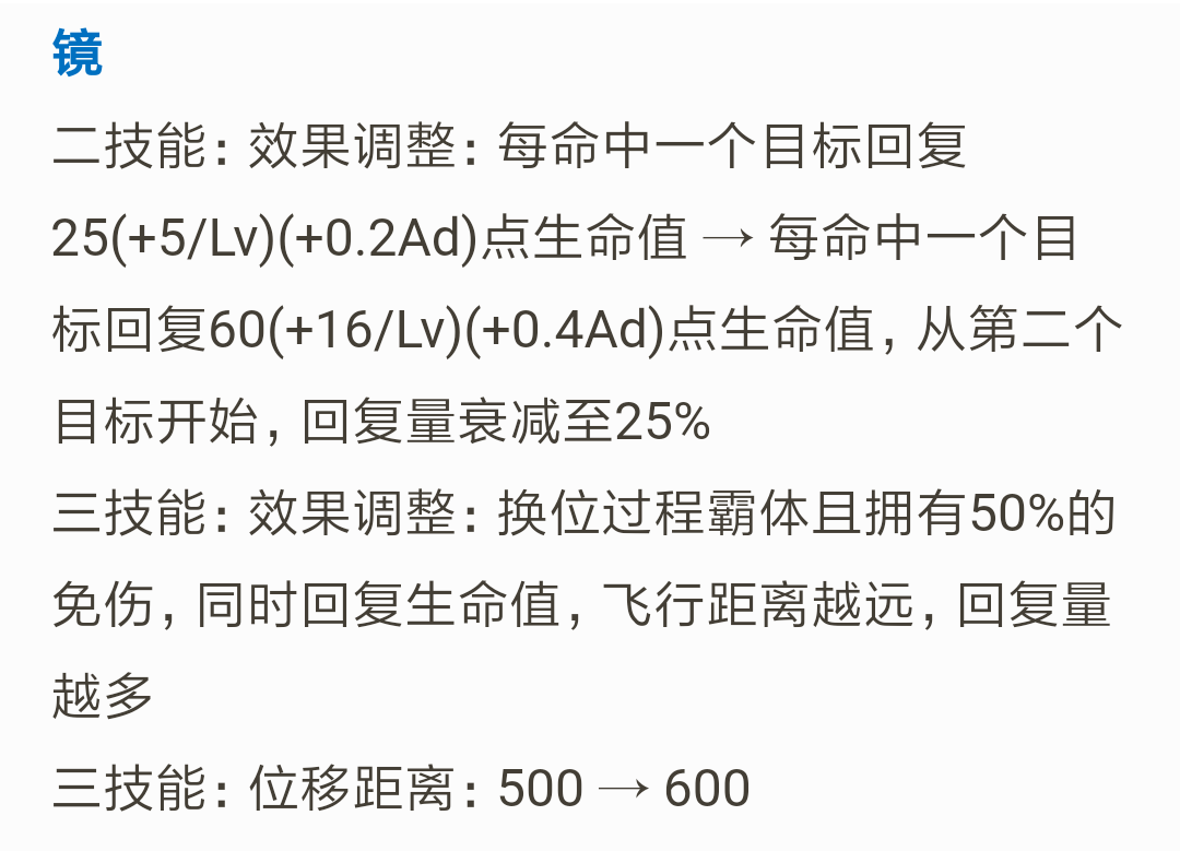 大家都知道,镜刚出来的时候还是很多人抢着体验的,不过由于身板太脆,现在除了一些主播在玩,好像基本没什么人玩了。而大家对镜这位英雄的了解程度也一般般,如果遇到一些玩镜比较好的玩家基本有点懵,飞来飞去不好抓,伤害还特别高。而最近体验服针对镜身板脆的问题又对镜进行了一波加强,请看下图