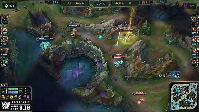 FPX击杀了火龙,双方爆发团战,打出一波1换1,FPX有些赚,但随后IG拿下FPX中路一塔。