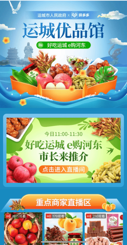 签约当天,市长储祥好、副市长崔元斌及运城下辖的12位市县长接力走进直播间,组成“助农天团”,为拼多多“运城优品馆”助力,全面推荐运城特色商品,展示地方文化。