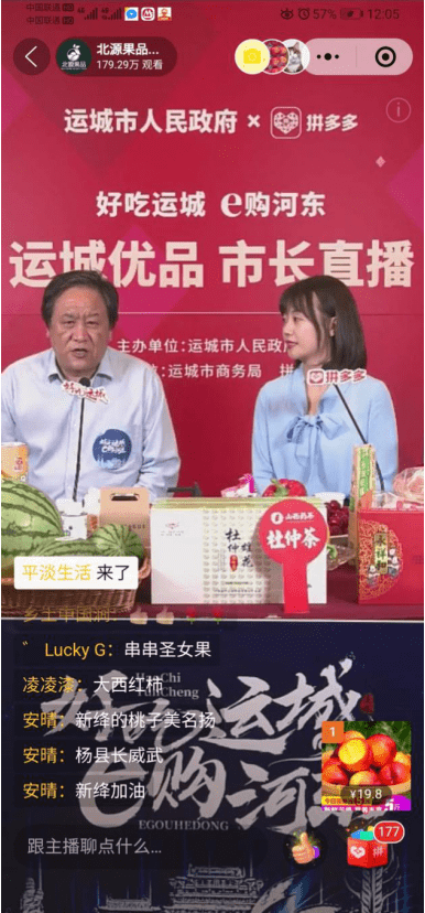 运城市前后共15位领导走进拼多多直播间,为运城的农产品带货可谓倾尽全力。在“助农天团”火力全开的推荐下,拼多多消费者涌入直播间,深入了解运城苹果、板枣、面粉、药茶、鸡蛋、樱桃等地方特色农产品后,踊跃拼单。