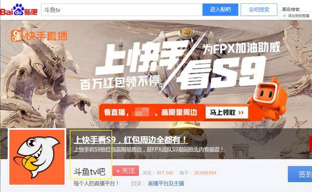 第二场结束小编来到贴吧与网友交流,发现一个有趣的事情,斗鱼TV的贴吧怎么被快手直播的巨幅海报给占据了,而且是骑头上呀!哈哈哈这也太逗了,一直高傲的斗鱼怎么会帮快手直播宣传呢,这么大的:上快手看S9,是怕大家看不到吗?游戏网