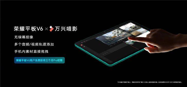 荣耀平板V6还与万兴喵影合作推出了无绿屏抠像、多个音频/视频轨道添加和手机内素材直接拖拽等功能。
