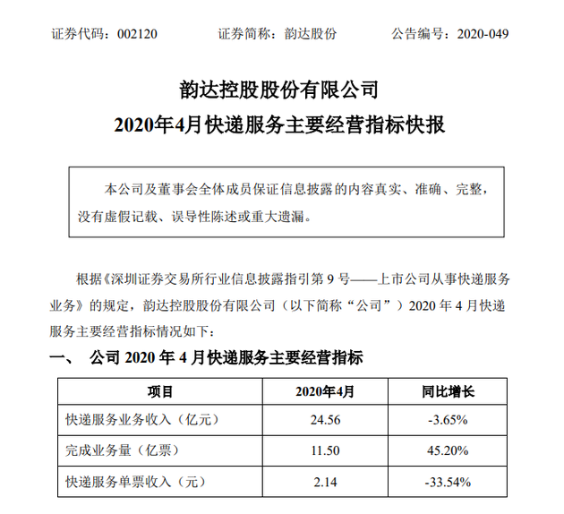 5月18日晚间消息,韵达股份发布公告称,2020年4月公司快递服务收入24.56亿元,同比下降3.65%;完成快递业务量11.5亿票,同比增长45.2%;快递服务单票收入2.14元,同比下降33.54%。
