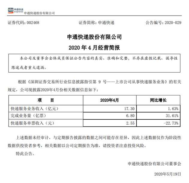 5月18日晚间消息,申通快递发布公告称,2020年4月公司快递服务业务收入17.3亿元,同比增长1.63%;完成业务量6.8亿票,同比增长31.61%;快递服务单票收入2.55元,同比下降22.73%。