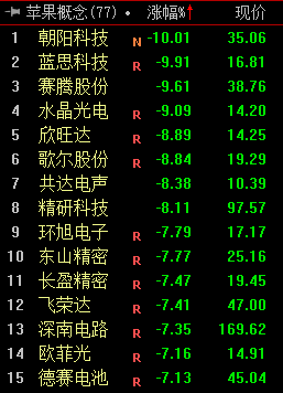 然而短短15分钟后,地震开始。芯片板块集体高位跳水,多个概念题材指数突然翻绿,受海外供货影响较深的苹果产业链领跌。同时,中芯国际股价也从8%快速跳水,至当日收盘,跌幅达6.37%。