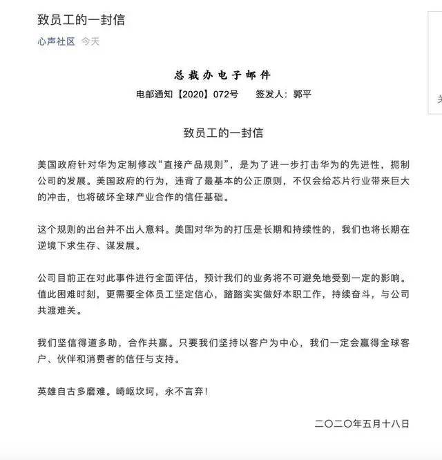 5月18日,华为在心声社区发布一封由轮值董事长郭平签发的“致员工的一封信”。信中称,美国政府针对华为定制修改“直接产品规则”,是为了进一步打击华为的先进性,扼制公司的发展。美国政府的行为,违背了最基本的公正原则,不仅会给芯片行业带来巨大的冲击,也将破坏全球产业合作的信任基础。