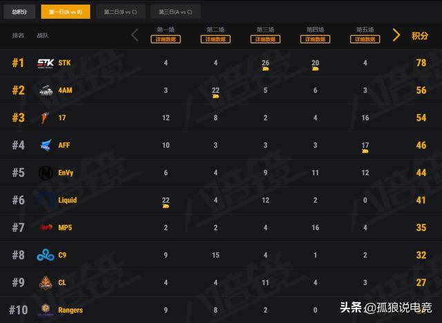 目前积分排名情况STK暂列第一,4AM战队和17战队分别位列第二和第三名,OMG由于昨天没有参加比赛,目前还没有排名。