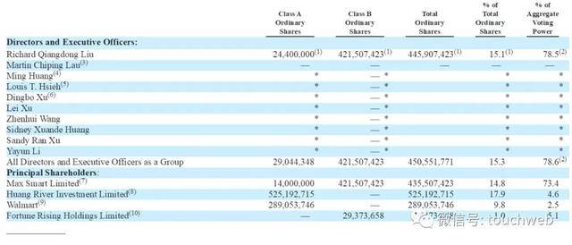 腾讯持有17.9%股权,及4.6%的投票权,为京东第一大股东。沃尔玛为京东第三大股东,持股为9.8%,拥有2.5%的投票权。