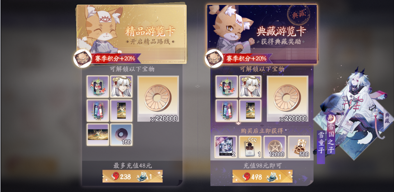 购入全新的精品或典藏游览卡,玩家们将获得更丰富的赛季畅玩奖励,如海量秘闻卷、全新异画卡、新头像、新卡背等游戏道具奖励。