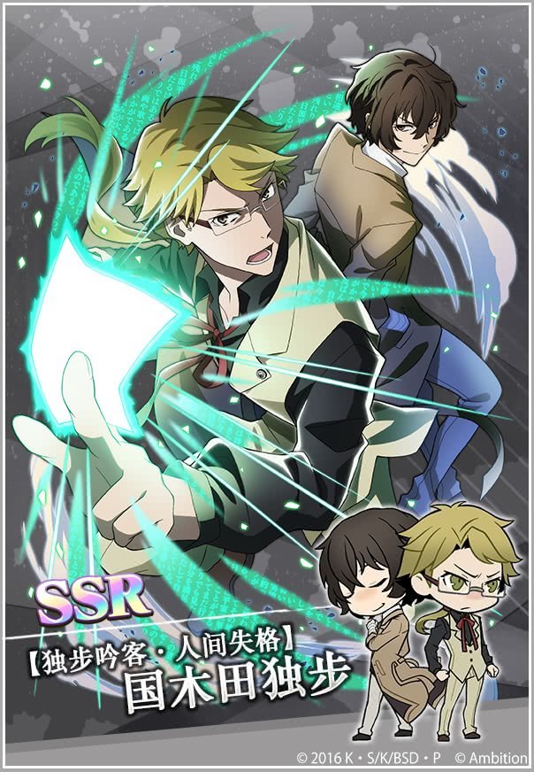 第二张限定SSR则是罕见的双角色卡牌——包括太宰治和国木田两名文豪的【独步吟客·人间失格】国木田独步。同为武装侦探社的成员,严谨认真的国木田和平日里总是显得有些脱线的太宰治看起来言行举止完全不在一个频道上。然而两个人在并肩战斗的时候却依然能发挥出合作无间的默契,完美完成任务。
