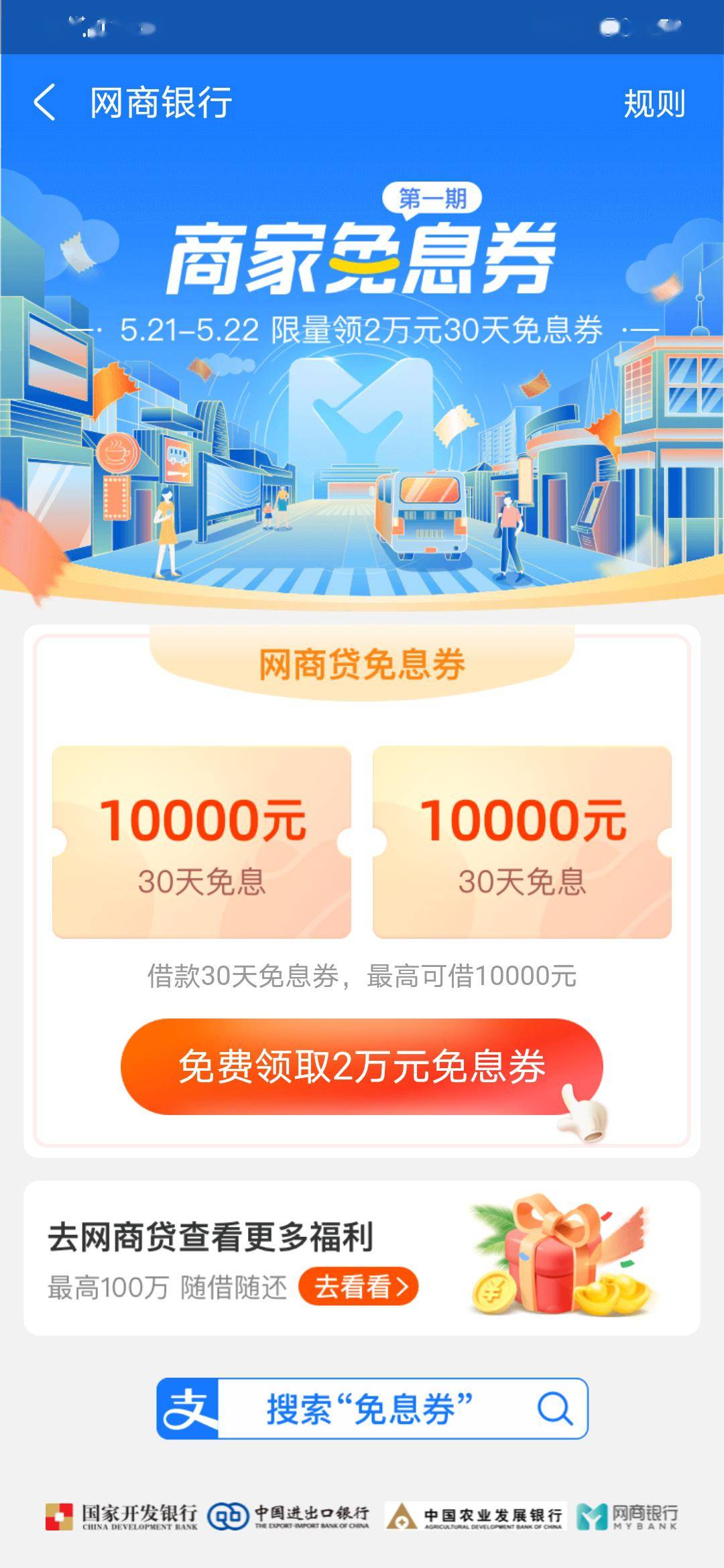 具体来说,有营业执照的小商家小店们,可以在支付宝上搜索“免息券”,通过信用风控评估,有贷款额度的用户都可以领取“免息券”,第一批每人可以领取2张,每张代表1万元贷款的1个月免息权利。