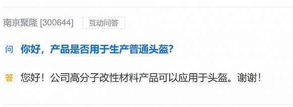19日涨停的南京聚隆,其主营改性塑料产品及塑木型材的研发、生产和销售,该公司在互动平台上就直接回应投资者表示,公司高分子改性材料产品可以应用于头盔。