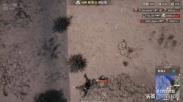 此时,KG两人不能走了,因为背后有独狼。于是他们转头过来清韦神,韦神打倒970之后血量不多,毒圈收缩过来,他只好往前走打了急救包,之后丢了两个雷,然后与r29对枪,但准头不够,反被r29打掉,4AM直接被淘汰。本来已经被打倒的970,在韦神死后也被其他队伍给补掉,所以4AM一个人头都没有拿到就被淘汰了,运气真的差。