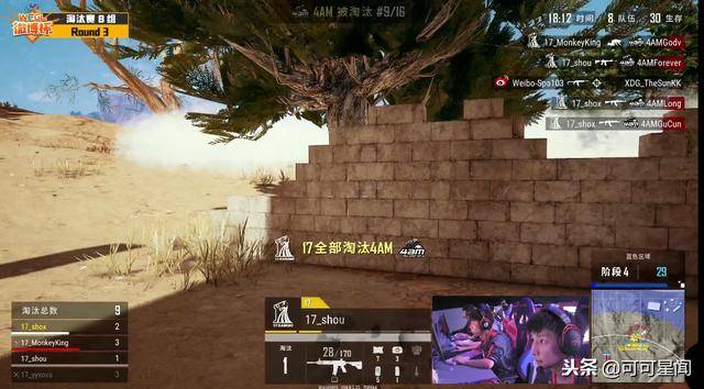 之后4AM转点,遇到17的新队员小鱼,直接收掉没有问题。之后在蓝白圈之间,4AM遇上了17战队的其他三人,4AM要进圈就得打掉前面的人,于是他们直接怼了上去,结果出人意料,17三人反打4AM满编,短短几秒钟就直接把4AM给团灭掉了。还好这把比前两把好很多,有拿到5个击杀分,如果后面的海岛图能够打好一点的话,拿个好名次晋级还是有机会的。