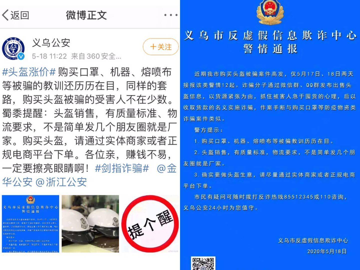 义乌公安转发并发微博提醒消费者:“头盔销售有质量标准,物流要求,不是简单发几个朋友圈就是厂家。请通过实体商家或正规电商平台下单。”