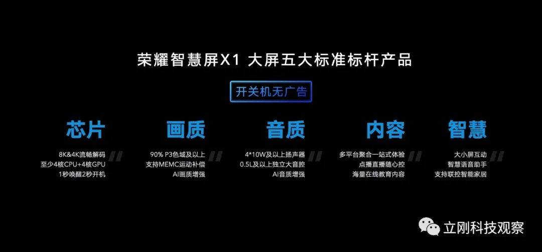 在笔者看来,有荣耀智慧屏X1系列作为标杆儿,后来者必须要符合智慧屏提出的五大标准,不然在产品力上落后,又不能提出智慧屏开关机无广告的体验,用户除非有很高的品牌信仰,否则没有理由去选择比荣耀智慧屏X1系列差的产品。