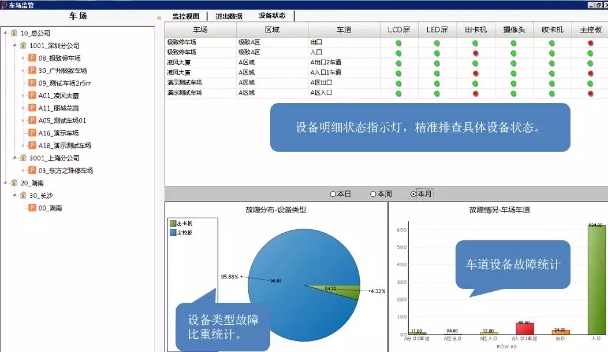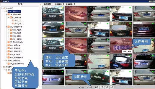 根据组织机构节点、车场、区域、车道节点以视图的方式实时监控各个车场的车道运行情况(绿灯代表运行正常、黄灯代表设备告警、红灯代表设备失联)。