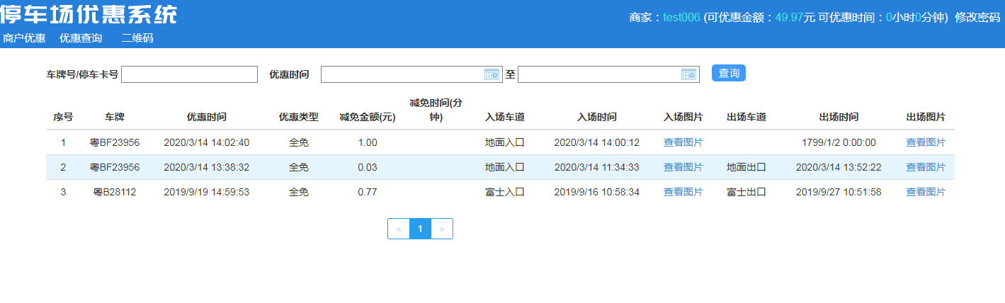 商户所有的优惠车牌、实际、金额、车辆进出信息都可以通过停车场优惠系统后台进行查看,并能够及时的显示该商户可优惠的剩余金额。