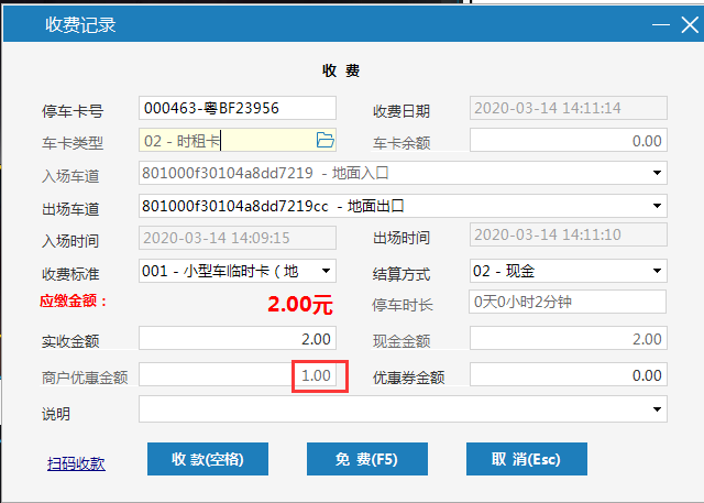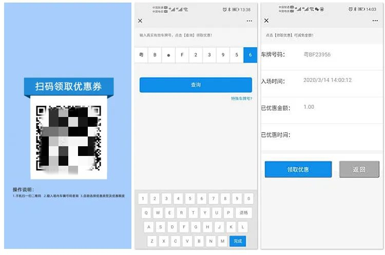 车主通过扫描优惠券领取二维码,输入车牌来进行优惠的领取,在出场时,自动减免优惠的金额。