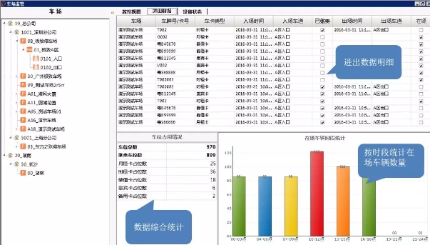 以数据列表、图表、统计的形式反映各个车场的车辆进出情况,可监看车位总数以及月租车占位数和时租车占位数等。