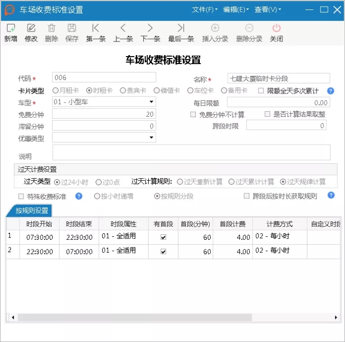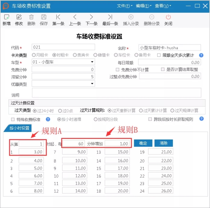 2、车场收费标准的计算规则分为两种类型:按小时设置、按规则设置。