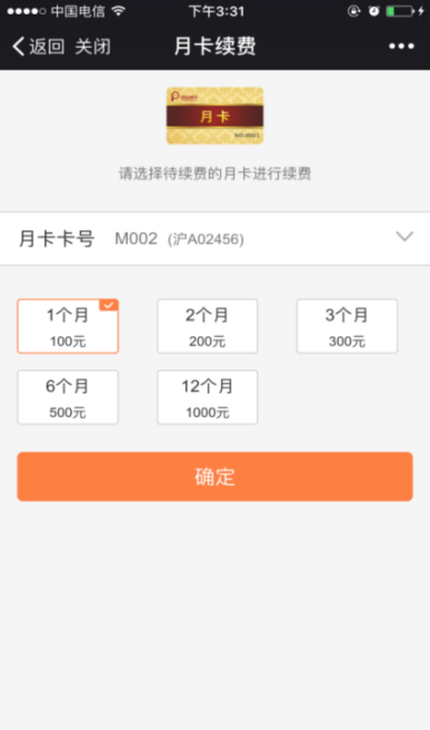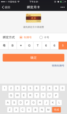 (1)车主进入月卡续费页面,绑定车牌号(如已绑定则不需要绑定,只需要选择车牌即可)