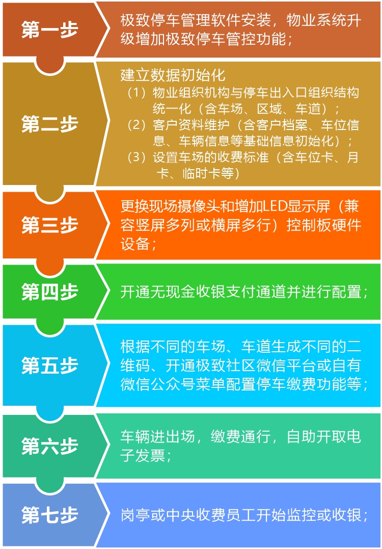 为解决以上难题,极致科技推出停车场改造方案,可通过仅更换摄像头实现车牌自动识别;或在不需要更换硬件设备的前提下,只需要远程升级极致物业管理软件、停车场软件以及开通移动支付来低成本快速实现真正无人值守落地与集中管控。改造后车主缴费更便捷,车场收入实时同步到总部,杜绝漏、冒、改等资金管理漏洞,轻量改造省钱、省时、省力。具体只需要以下七步即可轻松完成改造: