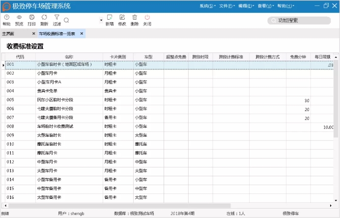 1、停车场收费标准可根据车卡类型和车型,设置多种标准(小型月卡车、小型车临时卡、中型车月卡贵宾卡、摩托车月卡等)。