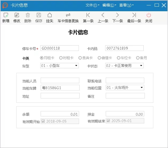 月租卡、储值卡、贵宾卡、备用卡、车位卡使用前必须进行客户档案建立,设置车卡的类型、车型、有效期、绑定车牌或人员信息、使用有效期、区域权限等信息。通过卡片信息一览表,可进行新增、修改、删除、挂失操作。实现物业集中管理各区域停车场卡片信息。