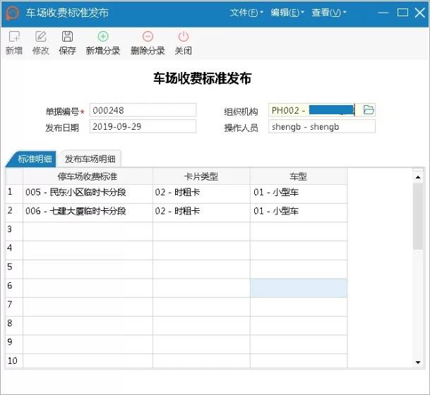 3、收费标准的发布分为单车场和多车场。停车场系统内的标准发布,默认发布到当前车场,多车场物业端可以选择下发到多个车场。