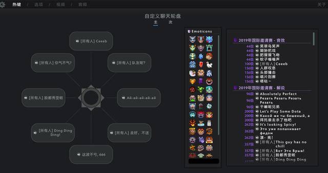 在这其中最受大家欢迎的当然就是【语音轮盘】功能了,玩家可以通过预先设置轮盘上的各种语音,在游戏中通过快捷键快速发出想要的语音。看上去这个功能好像平平无奇,其他游戏的语音也有类似“谢谢你”、“上路失踪”、“我需要治疗”这样常规游戏交流用词,但是v社毕竟是v社,Dota2的内置语音可以用两个字来精确描述——“魔性”