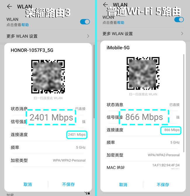 同时配合端到端凌霄芯片的加持,荣耀路由3还支持1024-QAM和160MHz大频宽工作模式,理论连接速率最高可达2976Mbps(574Mbps@2.4GHz +2401Mbps@5GHz),5GHz频段相比80MHz Wi-Fi 6网络的1200Mbps,理论速率直接翻番,相比80MHz的5G Wi-Fi 5网络(866Mbps),优势就更明显了。
