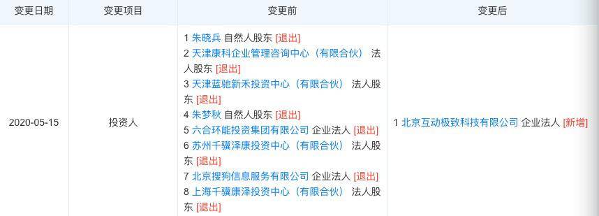 天眼查数据显示,5月15日,百科名医网的关联公司北京百科康讯科技有限公司发生工商变更,百科名医网创始人兼董事长朱晓兵卸任法定代表人、董事长,百科名医网CEO朱梦秋卸任经理,以上职位均由严授接任。与此同时,公司全部董事退出,新增严授为执行董事,何珊珊为监事。此外,包括搜狗、蓝弛创投等原股东全部退出,新增股东为北京互动极致科技有限公司,后者由字节跳动有限公司全资控股。