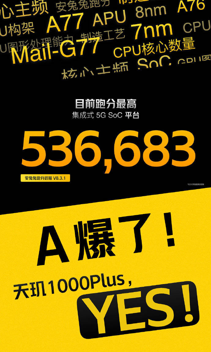 IT之家了解到,天玑1000Plus旗舰芯片采用7nm制程工艺打造,由4枚A77+9枚G77处理器内核架构,CPU主频高达2.6GHz,相比A76架构性能提升20%;GPU图形处理能力相较G76架构提升近40%,能效比提升30%。值得注意的是天玑1000Plus旗舰芯片安兔兔跑分超53万分(53668分),在目前所有5G集成SoC平台手机中位居首位。