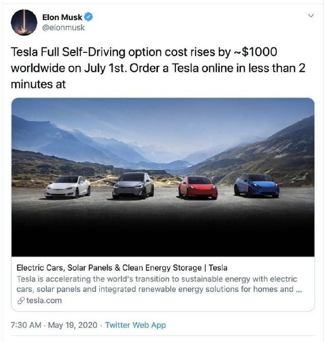 编后语:关于《特斯拉又双叒叕调价,这次是FSD,7月1日起涨价1000美元》关于知识就介绍到这里,希望本站内容能让您有所收获,如有疑问可跟帖留言,值班小编第一时间回复。 下一篇内容是有关《2020一季度家电市场排位:苏宁全渠道第一》,感兴趣的同学可以点击进去看看。