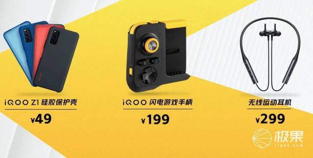 除了手机,iQOO还带来了三款新配件,iQOO Z1 硅胶保护壳、iQOO 闪充游戏手柄以及vivo 无线运动耳机,搭档iQOO Z1一起购买,分别只需39 元、159 元、 269 元。