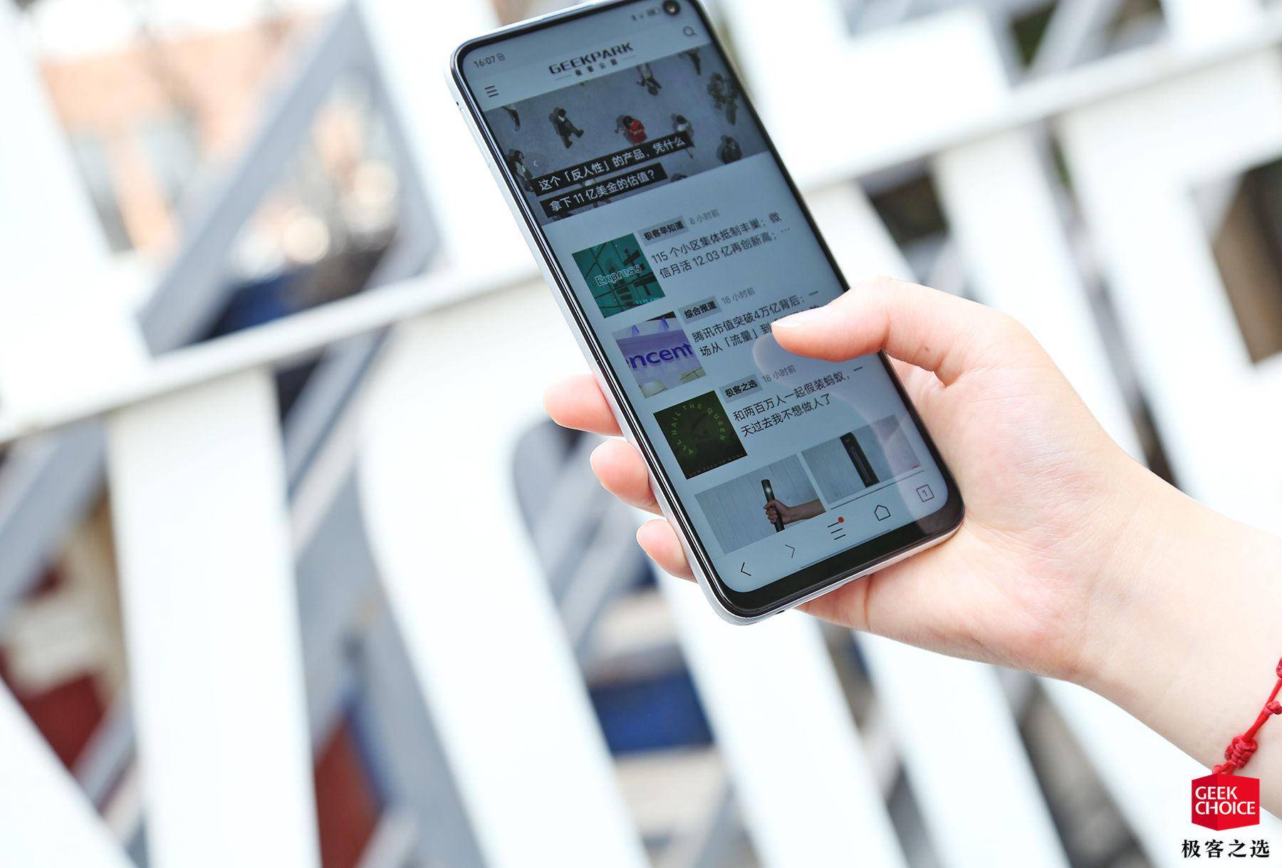 机身正面相对比较「无聊」,基本和 iQOO Neo3 保持一致(之前看过我们相关评测文章的朋友可以选择略过),采用了目前行业主流的挖孔屏方案,开孔同样位于屏幕右上角。有关开孔位置设定这里多说两句,目前常见的做法无非左上角、右上角和中间三种,从实际使用角度出发其实它们之间没啥太大区别,也谈不上哪种更合理,这部分不必太过纠结。