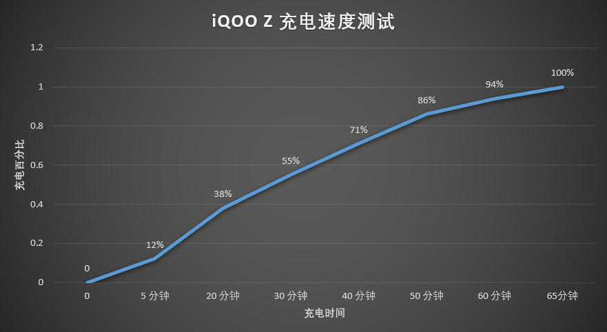 从我们绘制的充电速度折线图可以看到,iQOO Z1 前五分钟的充电速度比较快,整个充电过程中没有出现明显降速,94% 电量以后依旧保持了一个相对不错的速度,65 分钟将一块 4500mAh 电池充满的表现,放在一众快充方案中也处于比较靠前的水平。