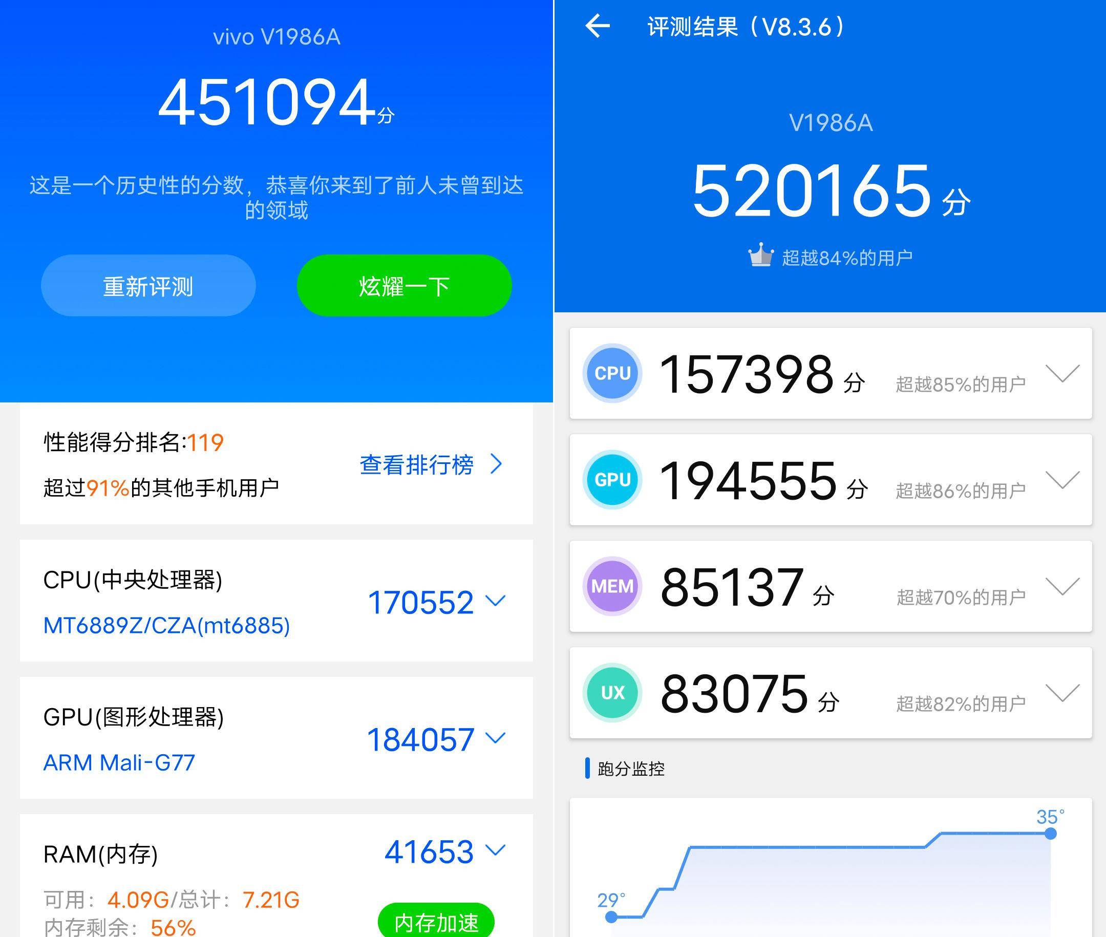 除了以上这些,天玑 1000Plus 还有两项特别值得注意的升级点,其一是加入对 144Hz 屏幕刷新率的支持,另外一项是引入了 5G UltraSave 省电技术,这恰恰是今年 5G 手机比较关注的地方,在 iQOO Z1 上也都有着很好的体现。实际性能表现方面,它的安兔兔跑分成绩为 520165 分,鲁大师为 451094 分,综合来看,逊色于以骁龙 865 为代表的顶级旗舰芯片,但领先一众中端 5G 芯片。