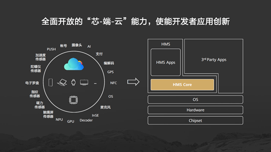 基于独特的 “芯-端-云”协同能力,华为终端云服务通过自有应用为全球用户带来了全场景智慧体验。同时,华为加速开放领先的“芯-端-云”能力,包括帐号、支付、地图、机器学习、HiAI、相机等数十项HMS Core核心能力,携手全球开发者和合作伙伴构筑HMS生态,加速应用体验创新,在全球范围内丰富华为终端产品的内容和服务,为消费者带来5G时代的全场景智慧生活体验。