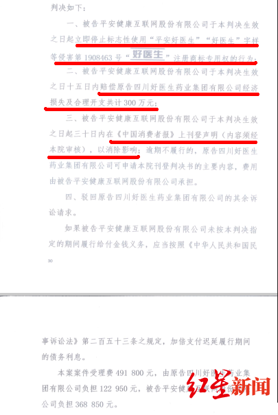红星资本局记者在《四川省成都市中级人民法院民事判决书》(2018)川01民初1608号和《四川省高级人民法院民事判决书》(2019)川知民终154号中找到了答案——原来,为了争夺商标权,平安健康被好医生公司诉至法院,最终法院认定,因其侵害了好医生公司的文字商标,判决其道歉、赔偿。