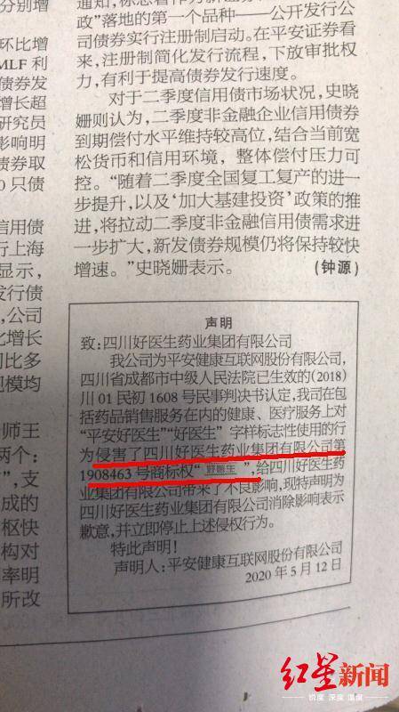 在身陷“抄袭门”(即:北京雪扬科技指出健康卫士涉抄袭)之后,平安健康又于5月12日登报声明——因侵害了“平安好医生”“好医生”字样标志性使用的行为,给四川好医生药业集团有限公司(以下简称“好医生公司”)带来不良影响而道歉。